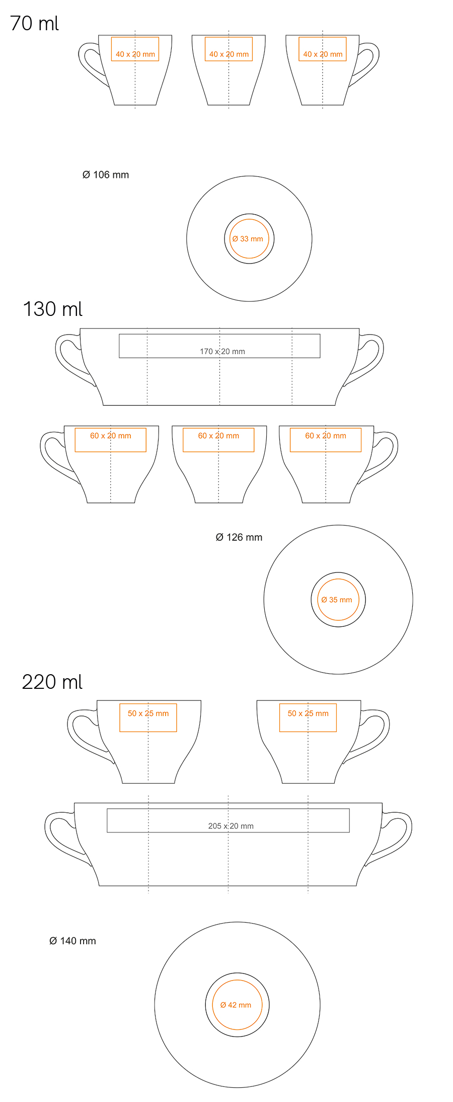 Dostępne techniki zdobienia dla produktu VERONA BIANCO SET: *  (70 / 130 / 220 ml)